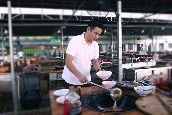 驚鴻一瞥,黃大廚手起鏟落,掀翻一塊塊滾動的雞肉。